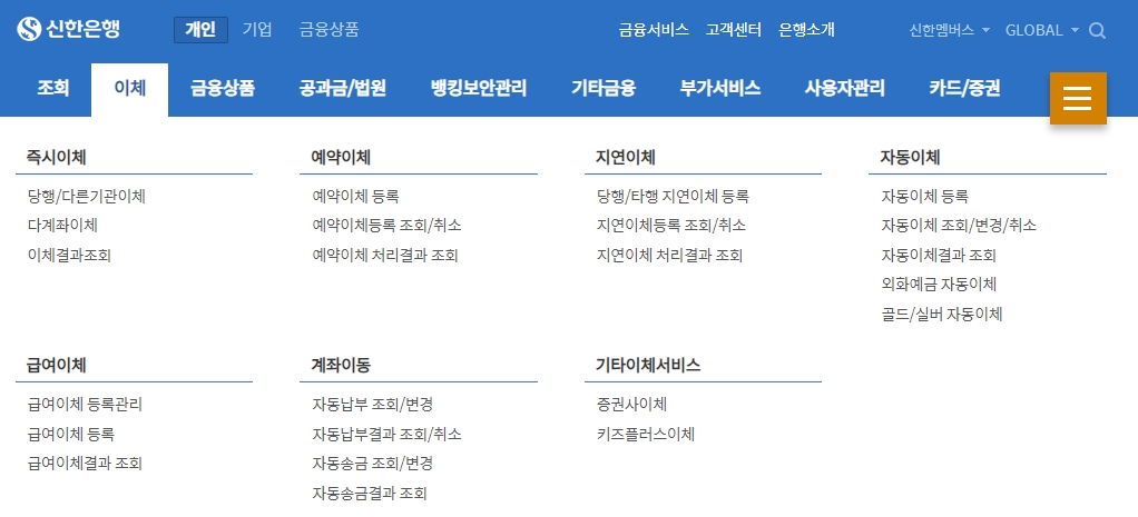 이체 메뉴에서는 즉시 이체, 당행·타행 이체, 다계좌 이체, 예약 이체 등 다양한 송금 방식을 제공합니다.