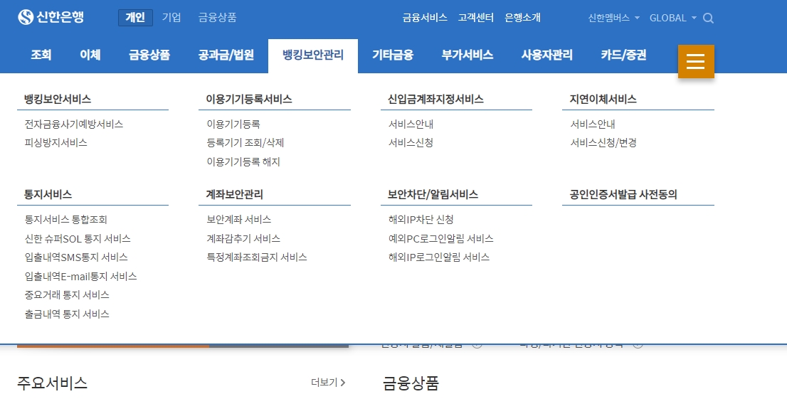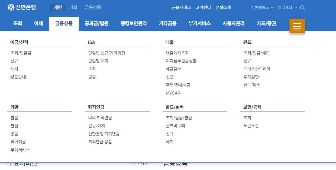 금융상품 메뉴에서는 예금, 신탁, ISA, 펀드, 외환, 퇴직연금, 금·은 투자 등 다양한 상품 정보를 제공합니다.