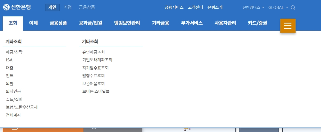 조회 메뉴를 선택하면 계좌 조회, 예금, 신탁, ISA, 펀드, 외환, 퇴직연금, 금·은 투자 상품 등 다양한 항목을 한눈에 확인할 수 있습니다.