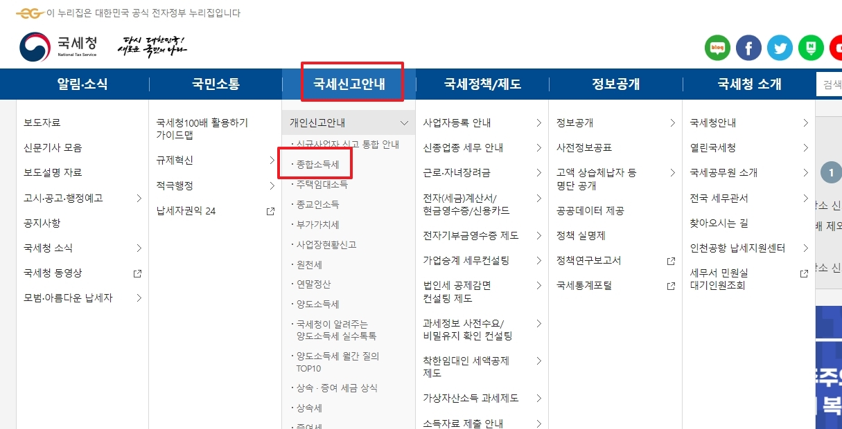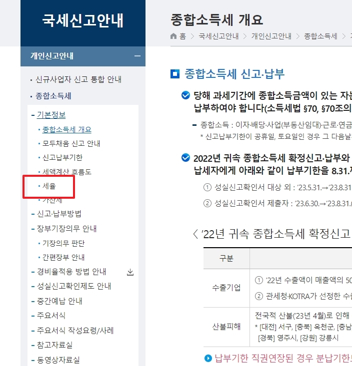 상단 메뉴 중 국세신고안내를 클릭하고 개인신고안내로 이동하면 종합소득세 메뉴가 나타납니다. 해당 페이지 좌측의 세율 항목을 선택하면 과세표준 구간별 세율과 누진공제가 정리된 표를 확인할 수 있습니다.