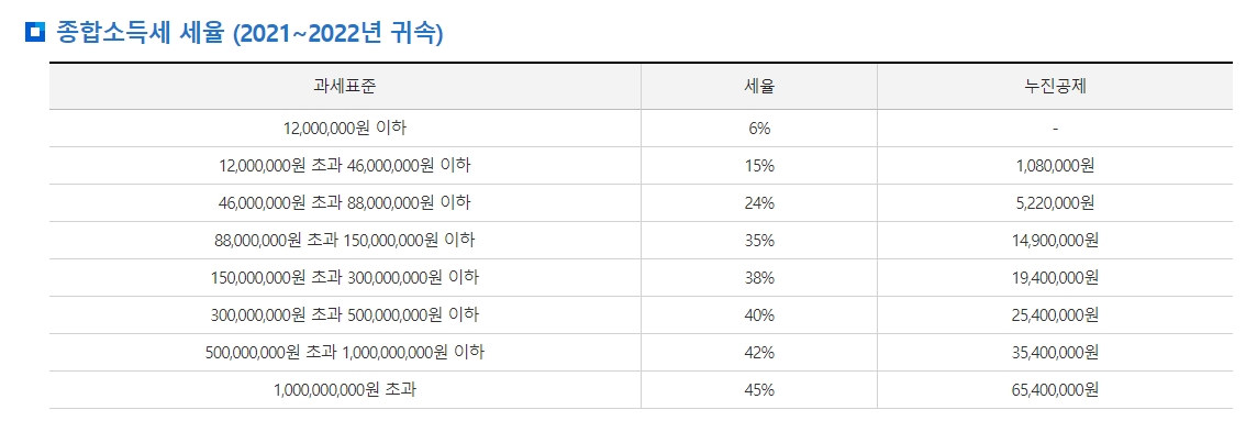 표 화면에서는 2021년부터 2022년 귀속분 세율표가 보여지며 2024년에도 이와 유사한 세율 체계가 적용될 것으로 예상됩니다. 과세표준 구간별로 세율과 누진공제 금액이 나열되어 있어 납세자는 자신의 소득 수준에 맞는 정확한 세액을 계산할 수 있습니다.