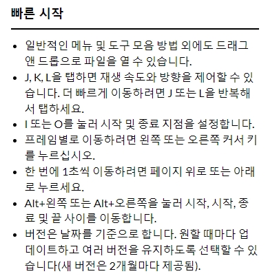 6. J, K, L 키로 재생 속도 및 방향을 조절하고 I, O 키로 시작과 종료 지점을 지정할 수 있습니다. 커서 키와 페이지 키로 프레임 단위 이동이 가능하며 Alt 키와 화살표 키 조합으로 특정 장면 간 빠른 이동이 지원됩니다.