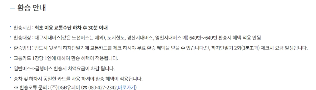 해당 안내 이미지는 최초 탑승 후 30분 이내에 대구 시내버스·도시철도·경산 및 영천 시내버스로 환승하는 방법과 뒷문 하차 단말기에 교통카드를 태그하는 절차를 시각적으로 설명하여 올바른 환승 혜택 이용을 지원합니다.
