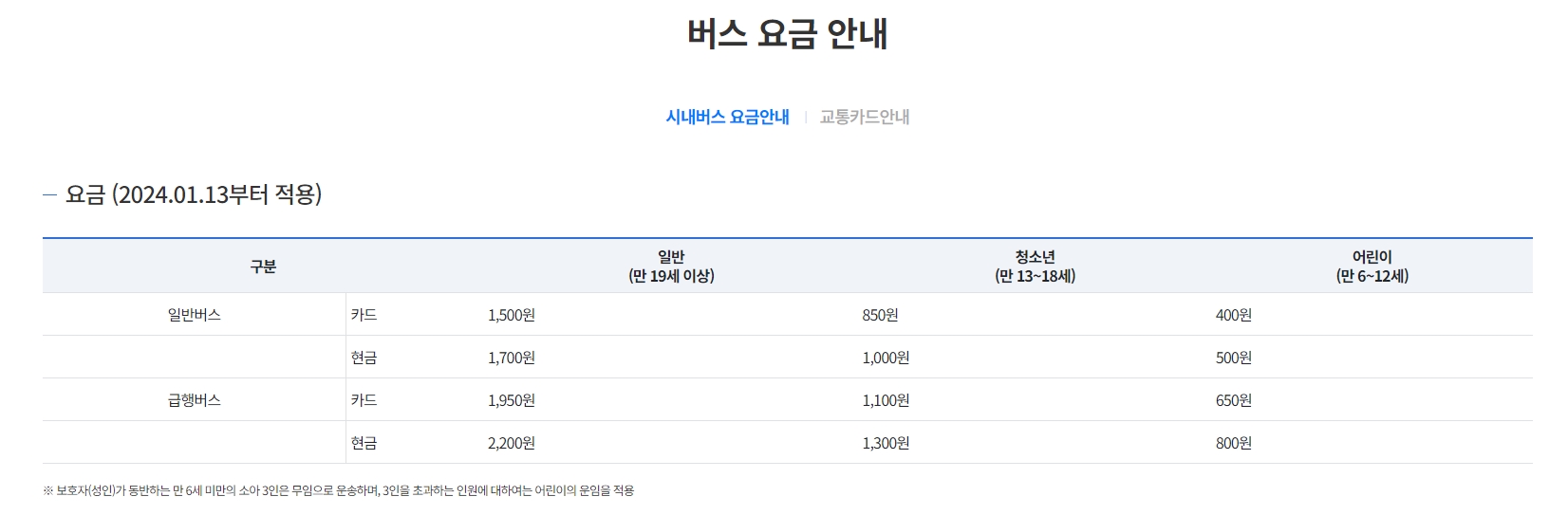 이 이미지는 2024년 1월 13일부터 적용된 일반버스와 급행버스의 교통카드현금 요금을 성인·청소년·어린이별로 비교하여 한눈에 확인할 수 있도록 표 형태로 구성된 자료입니다.