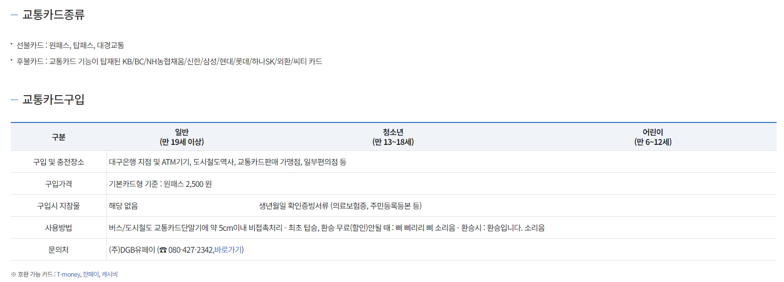 정확하고 최신의 요금 정보를 확인하기 위해서는 검색 엔진에서 '대구광역시 버스정보시스템'을 검색한 후 나오는 공식 홈페이지에 방문하시면 홈페이지 상단 메뉴의 '버스 이용 안내'와 '버스 요금 안내'에서 일반버스와 급행버스의 카드 및 현금 요금을 성인·청소년·어린이 구분으로 상세히 확인하실 수 있습니다.
