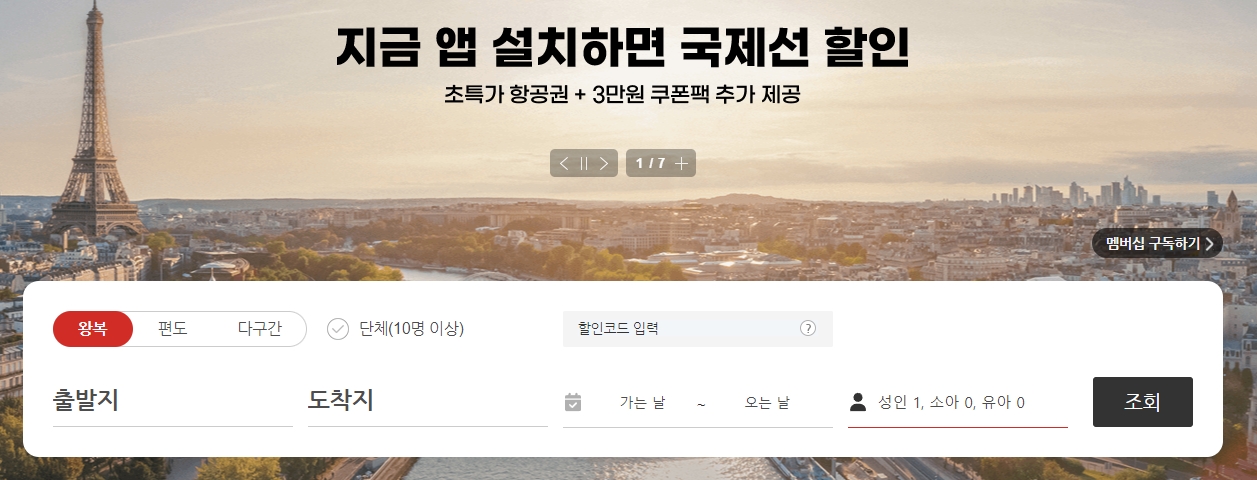 1. 홈페이지 첫 화면에서는 출발지와 도착지를 한눈에 확인할 수 있는 입력란이 제공돼요. 이 칸에 원하는 도시를 입력하면 곧바로 항공권 가격과 스케줄이 화면에 표시돼 예약 과정을 빠르고 쉽게 시작할 수 있답니다. 특히 달력 형태로 출발 날짜와 귀국 날짜를 시각적으로 고를 수 있어 복잡한 일정 입력 없이도 간편하게 일정 확인이 가능해요.