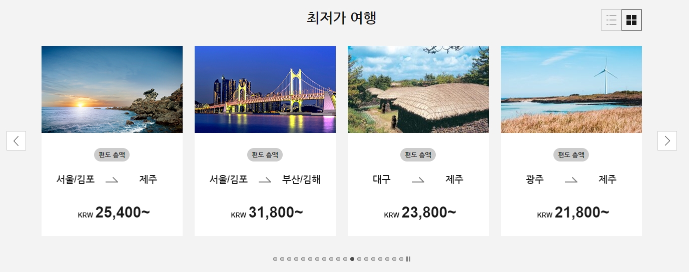 2. 홈페이지에서는 선택한 일정과 도시를 바탕으로 최저가 운임만 모아 보여주는 메뉴를 제공해 예산에 맞춘 항공권을 빠르게 찾을 수 있어요. 주중 할인 표시나 특가 노선 정보도 눈에 잘 띄는 아이콘으로 정리돼 클릭 한 번으로 상세 가격과 일정을 확인할 수 있답니다. 또한 대구와 광주, 제주 출발 노선도 쉽게 비교할 수 있어 지방에서도 편리하게 이용할 수 있어요.
