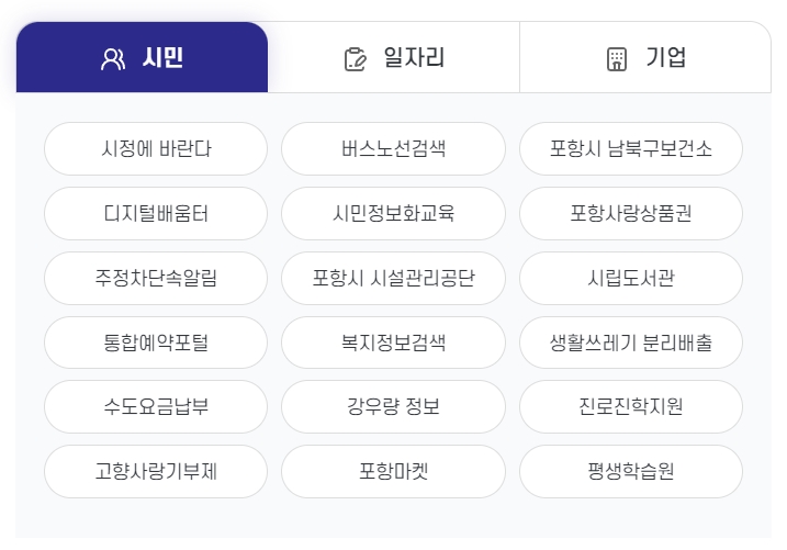 포항시청 홈페이지에서는 시정 소식과 공지사항을 비롯해 민원 신청·조회, 통합예약, 교통 안내, 분리배출 가이드 등 주민 맞춤형 서비스를 직관적인 화면 구성으로 제공하여 누구나 손쉽게 행정 정보를 확인하고 이용할 수 있습니다. 시민 참여 코너를 통해 신고·건의가 가능하며 공공 데이터를 제공해 투명성을 높여 행정에 신뢰를 더합니다.