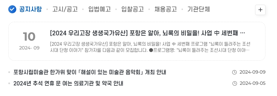 공지사항 탭에서는 새로운 공연 일정, 공공 프로젝트 참여 기회, 정책 변경 내용 등이 실시간으로 올라와요. 관심 있는 이벤트를 바로 신청할 수 있고, 과거 공지가 필요할 때 검색해서 찾아볼 수 있어요. 항상 최신 정보를 한눈에 확인할 수 있어서 편해요.