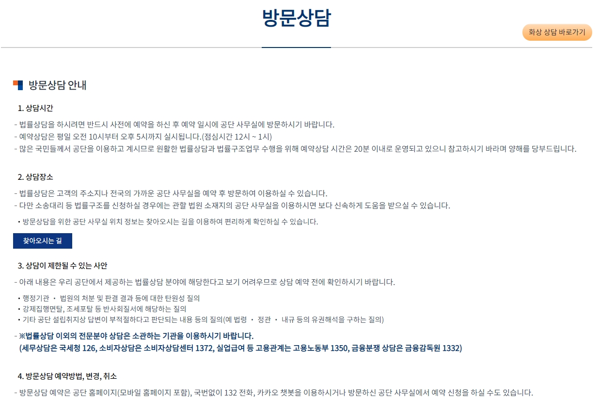 대한법률구조공단 방문상담 예약 화면에는 상담을 희망하는 지점별 일정과 시간을 확인할 수 있는 달력 형식 인터페이스가 제공되며, 원하는 날짜를 선택하고 간단한 인적 사항을 입력하여 무료상담 신청 절차를 마무리할 수 있습니다.