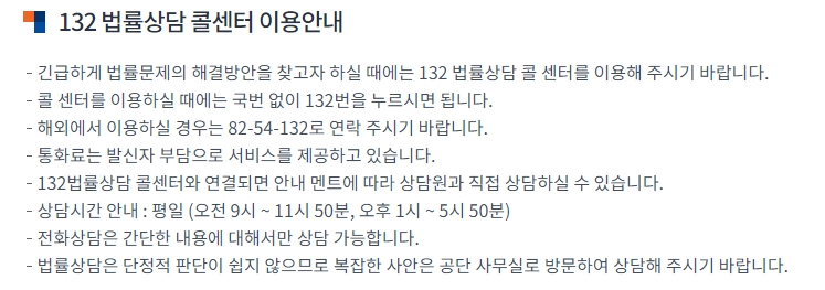 가장 쉽고 빠른 방법은 아마 전화일거에요. 급하게 물어볼 게 생겼을 때, 다른 번호 없이 그냥 132번만 누르면 바로 법률상담 콜센터로 연결이 됩니다. 평일 아침 9시부터 저녁 6시까지 상담원분들이 기다리고 계시니까, 이 시간 안에만 전화하면 궁금한 점을 바로 물어볼 수 있어요. 우리나라가 아닌 외국에 있을 때도 전화를 걸 수 있다니 정말 편리하죠.