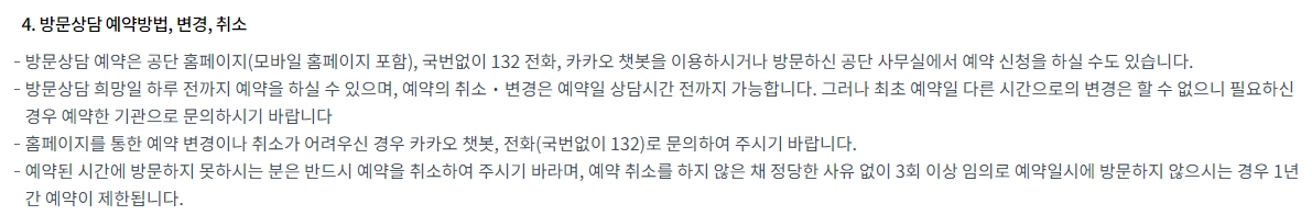 방문 상담 약속을 잡는 방법은 여러 가지가 있어요. 홈페이지에서 직접 신청하거나, 132번으로 전화하거나, 요즘 많이 쓰는 카카오톡 챗봇으로도 간단하게 예약을 할 수 있습니다. 최소한 상담받고 싶은 날 바로 전날까지는 예약을 마쳐야 해요. 만약 갑자기 일이 생겨서 못 가게 되면 약속 시간 전까지는 꼭 취소나 변경을 해야 합니다. 아무 말 없이 약속에 나타나지 않으면 다음에 예약할 때 불이익을 받을 수도 있으니 주의해야 해요.