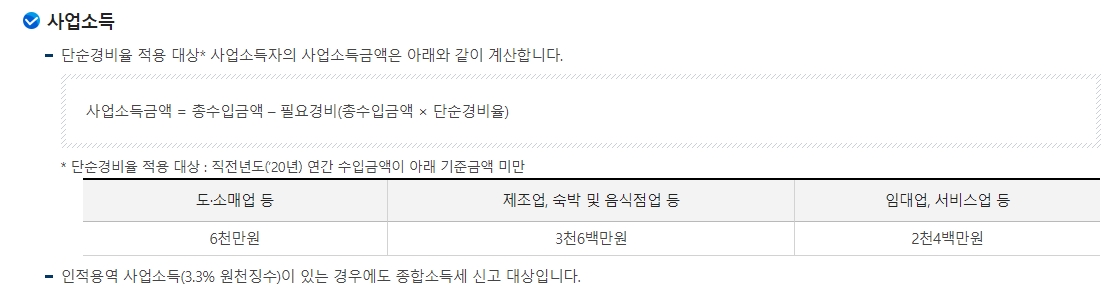 예를 들면, 물건을 떼다 파는 도소매업 같은 경우는 1년에 6천만원을 못 벌었어야 하고, 식당이나 공장 같은 곳은 3천6백만원, 그리고 월세 받거나 다른 서비스를 제공하는 일은 2천4백만원 미만으로 벌었을 때만 이 단순경비율로 세금 신고를 할 수 있어요.