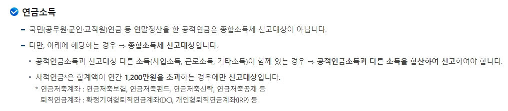 개인적으로 넣은 연금저축이나 퇴직연금 같은 사적연금에서 1년 동안 받은 돈이 총 1,200만원을 넘어가면, 이건 종합소득세 신고 대상이 되어서 다른 소득이랑 합쳐서 신고를 해야 한답니다. 1,200만원이 기준이니까 잘 기억해두세요.