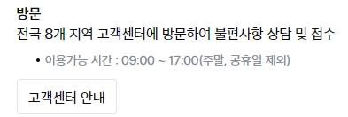 전국 8개 고객센터에서 평일 오전 9시부터 오후 5시까지 직접 상담 및 접수가 가능합니다. 대면 상담이 필요하신 경우 이 방법이 적합해요.