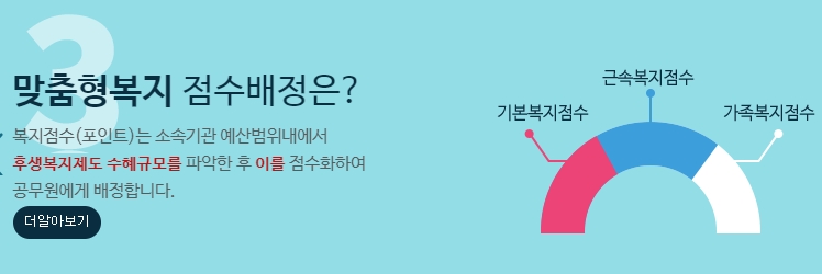 이 곳은 나라에서 공무원들을 위해 만든 특별한 공간으로, 개인마다 받은 복지 점수를 가지고 여행을 가거나, 건강관리를 받거나, 책을 사는 등 여러가지 좋은 일에 쓸 수 있도록 도와주는 아주 유용한 곳이에요. 공무원들의 생활에 보탬이 되고자 다양한 혜택들을 모아놓은 종합 선물세트 같은 곳이라고 생각하시면 이해하기 쉬울 겁니다.