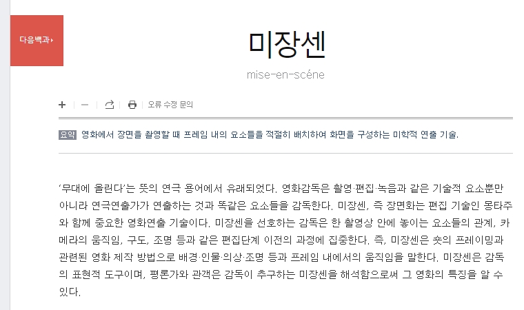 영화를 볼 때 화면에 보이는 모든 것은 사실 감독이 다 계획한 그림이라고 할 수 있습니다. 미장센은 바로 이 화면 속의 모든 시각적인 요소들을 말하는 거에요. 배우가 어디에 서 있는지, 조명은 얼마나 밝은지, 배경에 있는 물건이나 벽의 색깔 같은 것들 하나하나가 전부 여기에 포함됩니다. 감독은 이런 것들을 이용해서 말로는 다 설명하기 힘든 등장인물의 감정이나 앞으로 일어날 일에 대한 힌트를 우리에게 몰래 보여주는 것이죠. 그래서 미장센을 잘 살펴보면 영화를 훨씬 더 깊고 재미있게 즐길 수 있게 된답니다.