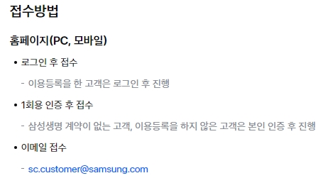 로그인 후 고객이라면 바로 접수 가능하고, 비회원도 본인 인증만 하면 접수 가능해요. 이메일(sc.customer@samsung.com)로도 접수할 수 있어서 편리합니다.