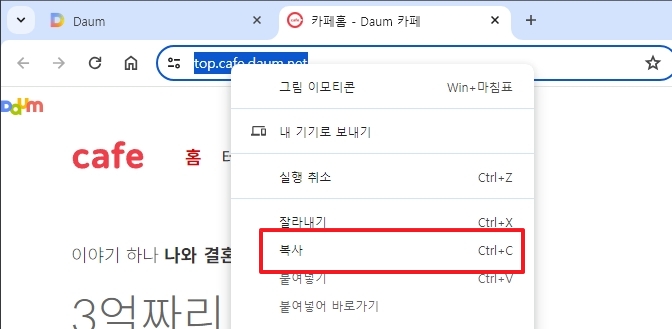 카페 메인 화면이 잘 열렸다면, 이제 인터넷 창의 맨 위를 보세요. 거기에 길게 영어랑 기호가 섞여있는 주소창이 보일 거에요. 그 주소 전체를 마우스로 쭉 긁어서 선택한 다음에, 마우스 오른쪽 버튼을 누르면 나오는 메뉴에서 '복사'를 선택해주세요. 이게 바로 바탕화면 바로가기를 만들 때 꼭 필요한 인터넷 주소(URL)를 컴퓨터에 잠시 저장해두는 과정이에요. 정확하게 전체 주소를 다 복사하는 게 중요해요.