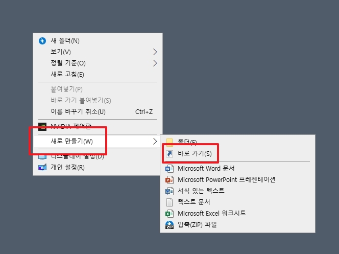 인터넷 주소를 잘 복사했다면 이제 열려있는 인터넷 창을 잠시 내려놓거나 끄고 컴퓨터 바탕화면으로 돌아오세요. 바탕화면의 아이콘이 없는 비어있는 아무 곳에나 마우스 커서를 두고 오른쪽 버튼을 한번 딸깍 눌러주세요. 그러면 여러 가지 메뉴가 나타나는데, 그중에서 '새로 만들기(W)'라는 항목에 마우스를 가져가면 옆으로 또 다른 메뉴가 펼쳐질 거에요. 거기서 '바로 가기(S)'를 찾아서 클릭하면 된답니다.