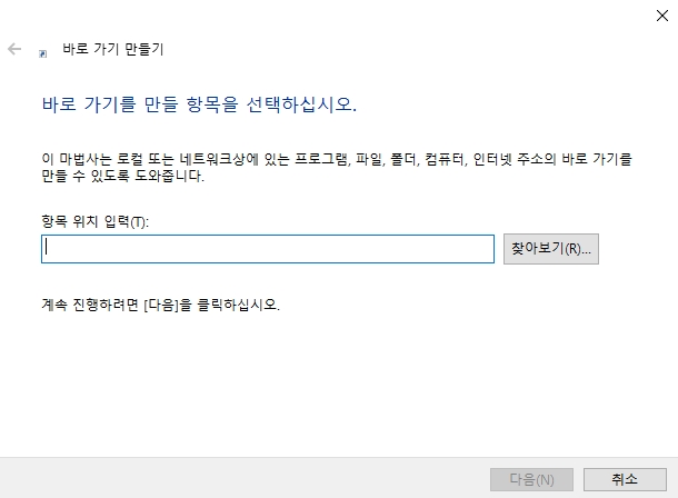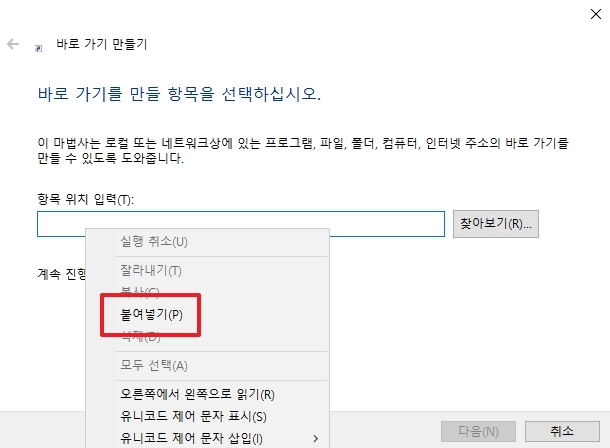 바로 가기를 누르면 '바로 가기 만들기'라는 새로운 창이 하나 뜰 거에요. 창 안을 보면 '항목 위치 입력'이라고 쓰여진 길고 하얀 빈칸이 보이죠? 아까 전에 우리가 복사했던 다음 카페의 인터넷 주소를 바로 여기에 넣어줄 차례에요. 하얀 빈칸에 마우스 커서를 두고 오른쪽 버튼을 누른 다음, '붙여넣기'를 선택하면 아까 복사해두었던 주소가 자동으로 착! 하고 입력될 거에요. 주소가 아주 길어도 걱정할 필요 없어요.