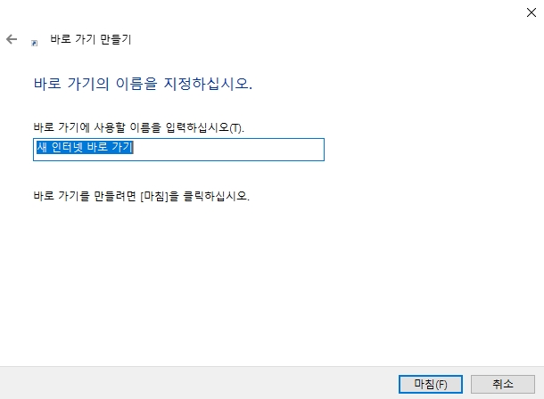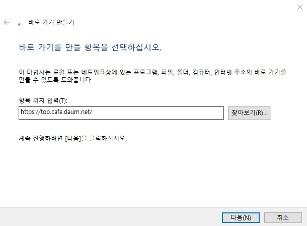 주소를 정확하게 붙여넣었다면 창 아래쪽에 있는 '다음' 버튼을 눌러서 다음 단계로 넘어가 주세요. 이제는 우리가 만들고 있는 바로가기의 이름을 정해주는 화면이 나타나요. 컴퓨터가 '바로 가기의 이름을 지정하십시오.'라고 물어볼텐데, '다음 카페' 라든지 '내가 자주 가는 카페'처럼 자기가 알아보기 쉬운 이름으로 자유롭게 입력하면 되요. 이름을 다 정했다면 마지막으로 '마침' 버튼을 누르면 모든 과정이 끝나요.