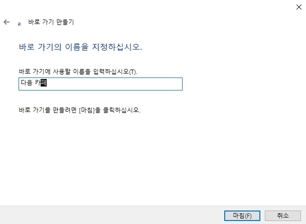 주소를 정확하게 붙여넣었다면 창 아래쪽에 있는 '다음' 버튼을 눌러서 다음 단계로 넘어가 주세요. 이제는 우리가 만들고 있는 바로가기의 이름을 정해주는 화면이 나타나요. 컴퓨터가 '바로 가기의 이름을 지정하십시오.'라고 물어볼텐데, '다음 카페' 라든지 '내가 자주 가는 카페'처럼 자기가 알아보기 쉬운 이름으로 자유롭게 입력하면 되요. 이름을 다 정했다면 마지막으로 '마침' 버튼을 누르면 모든 과정이 끝나요.