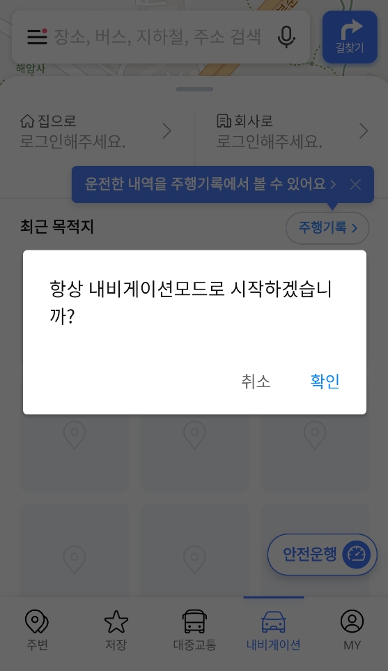 이제 지도 화면이 보이면 아래쪽에 여러가지 글자들이 보일텐데, 그 중에서 '내비게이션'이라고 써있는걸 눌러주세요. 그러면 차 탈때 쓰는 화면으로 바뀌거든요. 이때 앞으로 앱을 켤때마다 이 화면을 먼저 보여줄까요? 하고 물어보기도 하는데, 운전할 때만 주로 쓴다면 '네'라고 하는게 편하고, 평소에 지도 검색도 자주하면 '아니요'를 누르는게 더 나을수도 있어요.