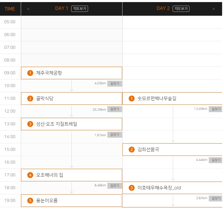 추천 일정 메뉴에 들어가면 여러가지 주제에 따라서 잘 짜여진 여행 동선을 제안해주고 있어요. 이걸 그대로 따라다니기보다는, 여기서 마음에 드는 장소나 맛집 몇 군데를 골라서 나만의 여행 계획에 추가하는 방식으로 활용하면 좋아요.