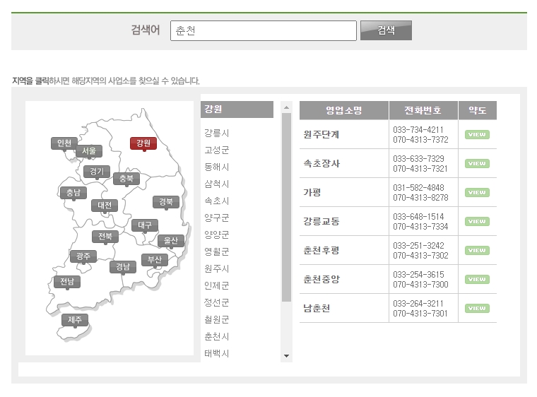 춘천을 검색하니 원주, 속초, 가평, 강릉 등 춘천이 아닌 다른 지역의 영업소까지 함께 표시되는 것을 볼 수 있습니다. 이는 춘천과 인접한 주변 지역의 영업소들을 한 번에 보여주는 기능 덕분일 수 있습니다. 따라서 내가 찾으려는 춘천 시내의 영업소뿐만 아니라, 근처 다른 지역의 정보까지 한눈에 파악할 수 있는 장점이 있습니다.