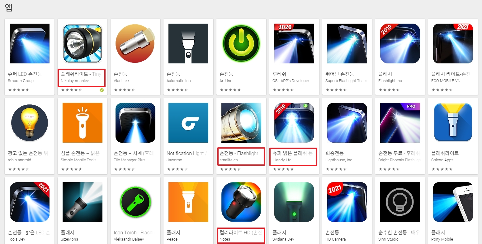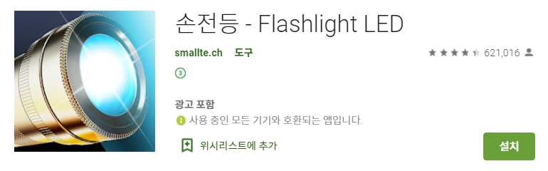 이렇게 많은 앱 중에서 어떤 것을 골라야 할지 모르겠다면, 사람들이 가장 많이 내려받고 오랫동안 순위권에 있는 앱을 선택하는 것이 좋은 방법이 될 수 있습니다. 많은 사람들이 사용했다는 것은 그만큼 기능이 안정적이고 큰 문제가 없다는 뜻이기도 하거든요. 문제가 생기더라도 개발자들이 빠르게 업데이트를 해주는 경향이 있어서 믿고 쓸 수 있죠. 플래쉬라이트(Flashlight) 같은 이름의 앱들이 보통 이런 종류에 속하는데, 복잡하지 않고 쓰기 편한 것들이 많습니다.