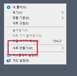 그러면 여러 가지 메뉴들이 쭉 나타나는데, 그 중에서 새로 만들기라고 쓰여있는 글자를 찾아서 마우스를 살며시 올려두기만 하면 된답니다. 아직 클릭하는게 아니에요. 그냥 올려두기만 하면 옆으로 또 다른 메뉴가 열릴거에요.