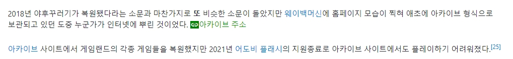 실제로는 웨이백머신이라는 인터넷 아카이브를 통해서 과거의 모습이 일부 저장되어 있었지만, 2021년부터는 플래시 지원이 완전히 끊기면서 게임을 하는 것이 거의 불가능해졌습니다.