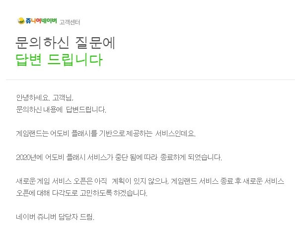 게임랜드의 서비스가 완전히 멈춘 것은 아니고, 2018년과 2019년에 걸쳐서 차례대로 서비스가 종료되었습니다. 가장 큰 이유는 바로 어도비라는 회사에서 플래시 프로그램에 대한 지원을 더 이상 하지 않기로 결정했기 때문이에요.