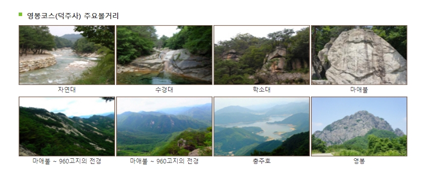 여러 영봉코스 중에서도 덕주사에서 출발하는 코스는 특히 인기가 많습니다. 이 코스를 따라 걸으면 송계팔경의 일부와 보물로 지정된 마애불을 만날 수 있고, 무엇보다 시원하게 펼쳐진 충주호의 전경을 감상할 수 있어 더욱 특별해요.