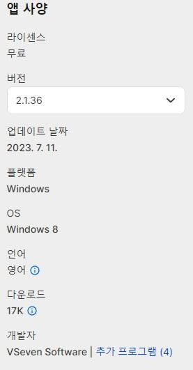 현재까지 약 17,000회 다운로드 되었으며, 개발자는 VSeven Software입니다. 생각보다 많은 사람들이 내려받았다는 것을 알 수 있네요.