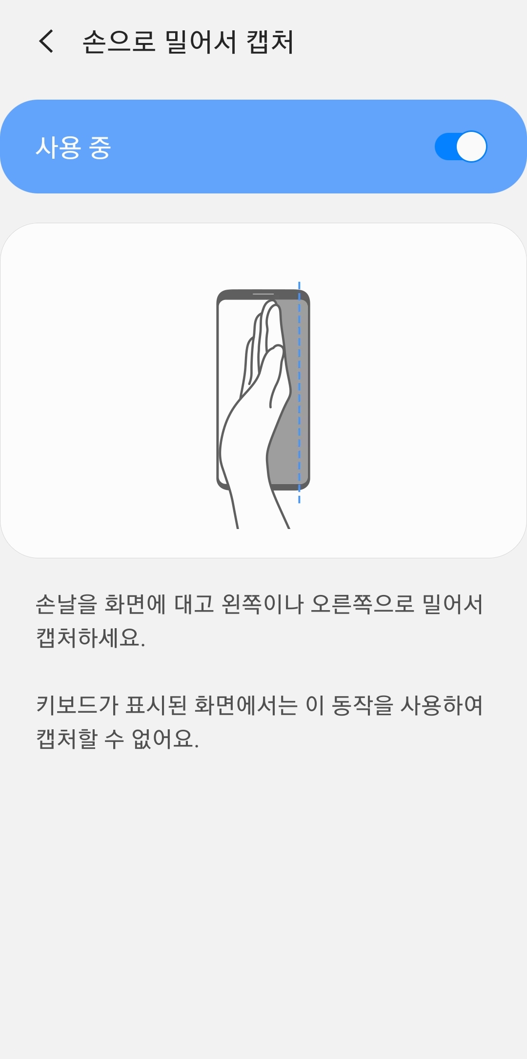 모션 및 제스처 메뉴에 들어오면 손으로 밀어서 캡처라는 항목이 보일 거예요. 이 기능의 스위치를 켜주세요. 그러면 이제부터는 손날을 화면에 대고 오른쪽에서 왼쪽으로, 또는 왼쪽에서 오른쪽으로 쓱 밀기만 하면 화면이 바로 찍히게 됩니다.