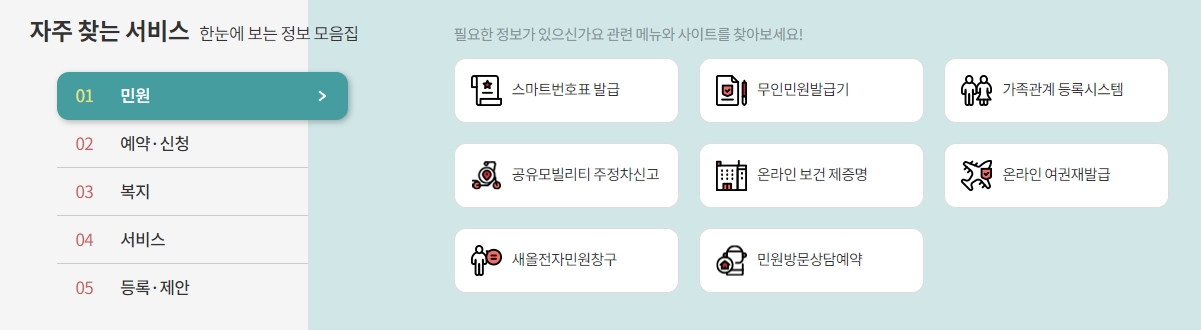 종합민원, 분야별 민원, 민원신청이 전부 가능하고, 스마트 번호표 발급 같은 편의 기능도 있어서 직접 방문하지 않아도 민원 처리를 간편하게 할 수 있어요.