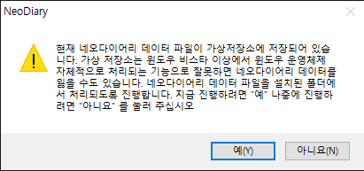 설치가 끝나고 네오 다이어리를 처음 켜면 조금 어려운 말이 나오는 창이 뜰 수 있어요. '가상저장소'라는 말이 나오는데, 이건 내 다이어리 기록이 이상한 곳에 저장될 수 있으니 안전한 폴더로 옮기겠냐고 물어보는 거예요.