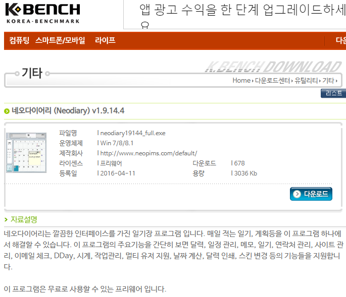 컴퓨터에서 일정을 관리하고 싶을 때 쓰는 네오 다이어리를 받으려면, 먼저 인터넷 검색창에 '네오 다이어리'라고 쳐보세요. 그러면 여러 웹사이트가 나오는데, 그중에서 케이벤치(K-bench) 같은 자료실 페이지로 들어가면 됩니다. 이런 곳은 예전 프로그램들을 모아두어서 찾기 편해요.