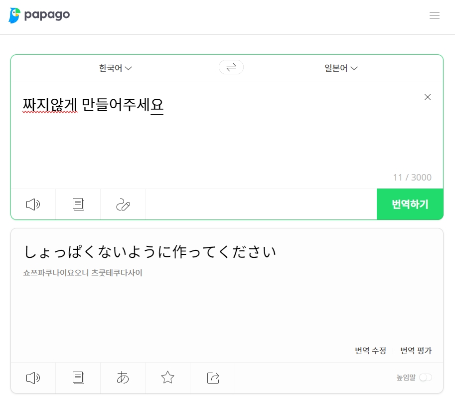 이렇게 간단한 문장은 '짜다', '않다', '만들다'와 같은 기본적인 단어들로 구성되어 의미가 명확하게 전달됩니다. 핵심 단어 위주로 간결하게 요청하면 번역기는 더 정확하고 자연스러운 번역을 제공하여, 일본 현지 식당이나 상점에서 원활하게 소통하는 데 큰 도움을 줍니다.