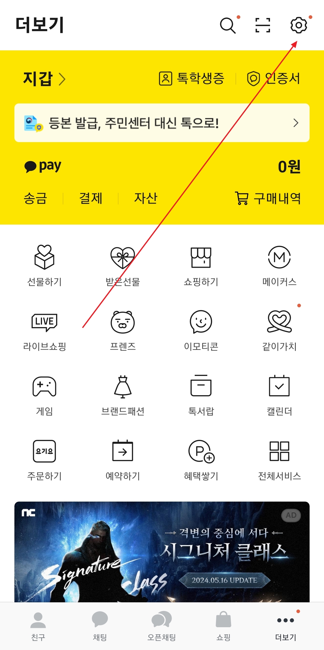 가장 먼저 카카오톡 앱을 열고 화면 오른쪽 맨 아래에 있는 점 세 개 모양의 '더보기' 메뉴를 눌러주세요. 이어서 화면이 바뀌면 오른쪽 위에 보이는 톱니바퀴 모양의 '설정' 아이콘을 탭하여 다음 단계로 이동합니다. 카톡 아이디 확인 절차의 첫걸음이니 잘 따라와 주세요.