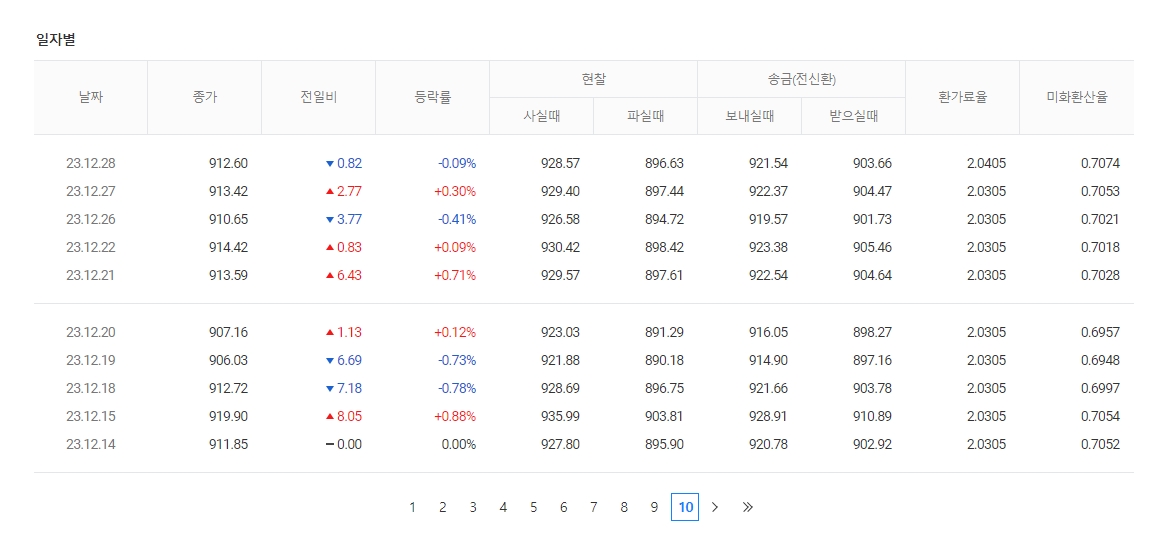 과거 환율 기록을 더 오래전으로 돌려보고 싶다면, 페이지 하단의 페이지 번호를 이용해 이전 내역을 조회할 수 있습니다. 날짜를 직접 입력하여 검색하는 기능은 없으므로, 이 페이지 이동 기능을 활용해야 합니다. 한 번에 10페이지씩 건너뛸 수 있어 원하는 시점까지 비교적 빠르게 찾아갈 수 있습니다.