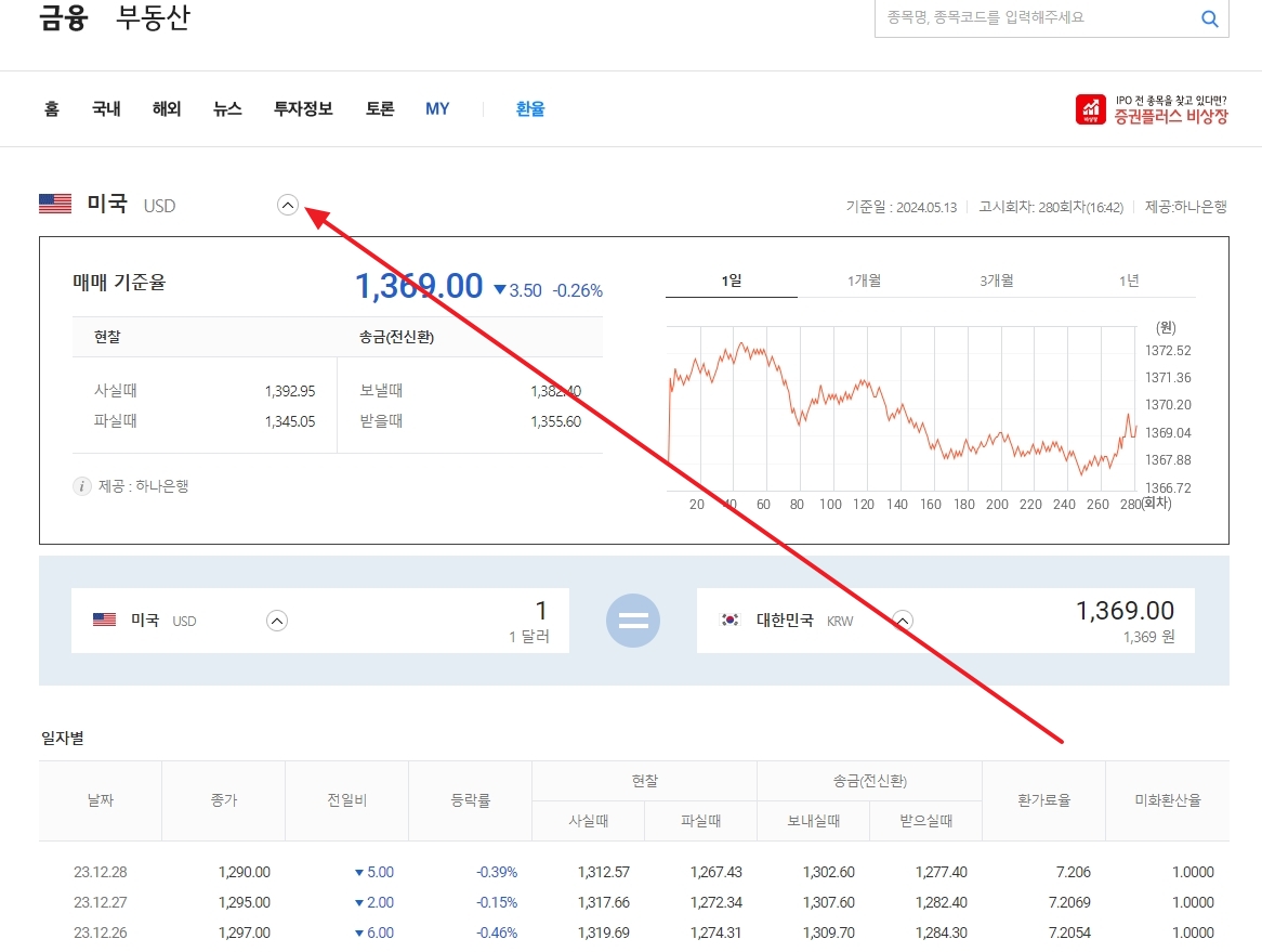 다음(Daum) 일자별 과거 환율 조회