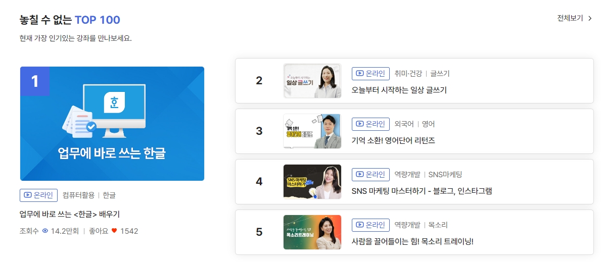 인기 강좌 TOP 100, 생애주기별 추천 강좌, 테마별 인기 강좌 등 다양한 추천 콘텐츠가 모여 있습니다. SNS 마케팅, 한글 강의, 일상 글쓰기처럼 실제 업무나 생활에 바로 적용할 수 있는 실용 강의가 많아요.