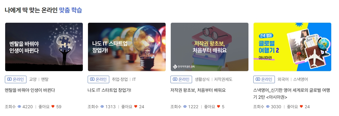 맞춤형 온라인 학습 섹션은 학습자의 관심과 필요에 따라 강의를 추천해줍니다. 멘탈 관리, IT 스타트업 창업, 저작권, 외국어 등 실생활에 밀접한 주제들이라서 실용성과 활용도가 높습니다.