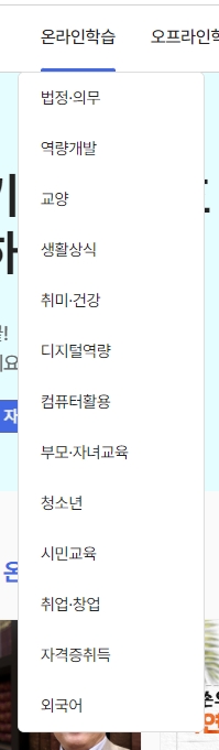 법정·의무, 디지털 역량, 컴퓨터 활용, 자격증, 육아·자녀 교육 등으로 분류된 ‘분야별 학습 바로가기’ 메뉴를 통해 원하는 주제의 강의를 빠르게 찾을 수 있어요. 메뉴가 직관적이라 처음 이용해도 어렵지 않습니다.