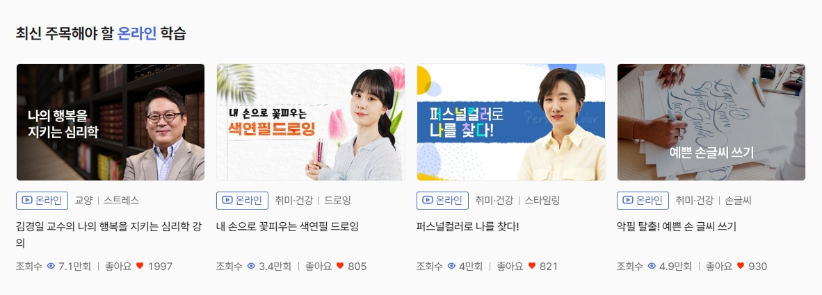 ‘주목해야 할 온라인 학습’ 섹션에서는 심리학, 드로잉, 퍼스널컬러, 손글씨 쓰기 등 요즘 사람들이 많이 찾는 트렌디한 강좌를 살펴볼 수 있습니다. 강좌마다 조회수와 좋아요가 함께 표시되어 있어, 인기 강의인지 쉽게 파악할 수 있어요.