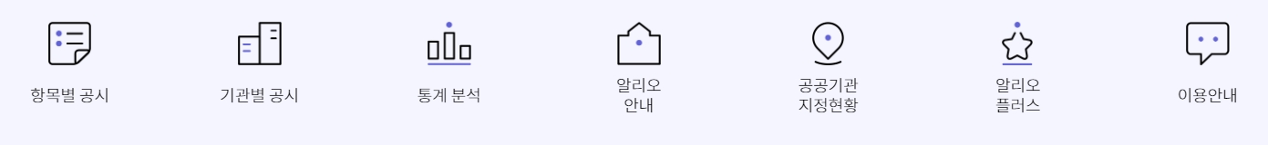이 영역에서는 알리오의 전체 구조를 확인할 수 있어요. 소개, 제도 설명, 기관 정보 등 핵심 항목들이 요약되어 있어 처음 이용하더라도 어떤 기능이 어디에 있는지 빠르게 파악할 수 있습니다.