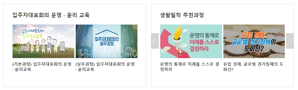 입주자대표회의 운영·윤리 교육은 기본과 실무 과정으로 나뉘며, 운영 절차부터 회의록 작성, 윤리 사항까지 학습할 수 있습니다. 생활밀착 추천과정에서는 경제, 미래설계 같은 실생활에 필요한 내용도 배울 수 있어요.